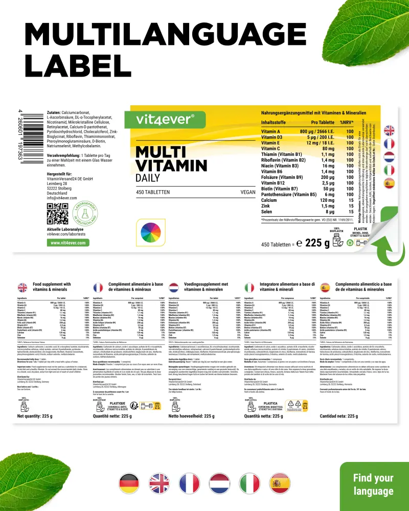 The tablets contain vitamins A, C, D3, E, B1, B2, B3, B5, B6, B7, B9 and B12, as well as the minerals calcium, zinc and selenium.