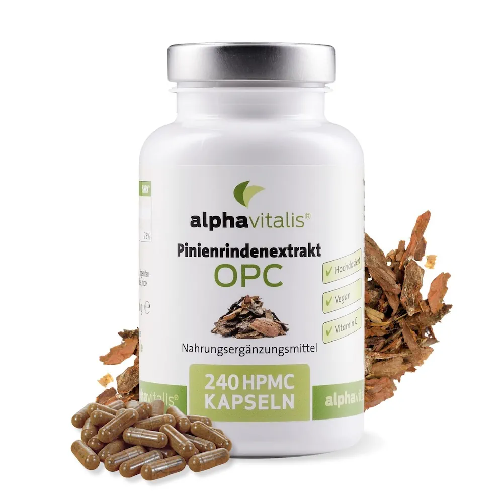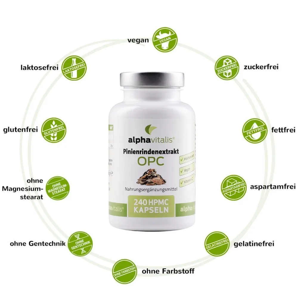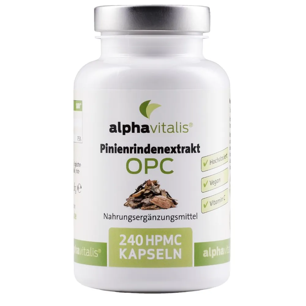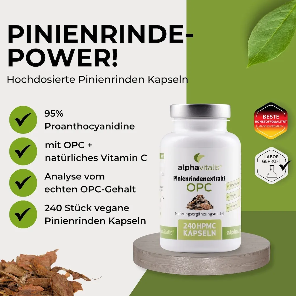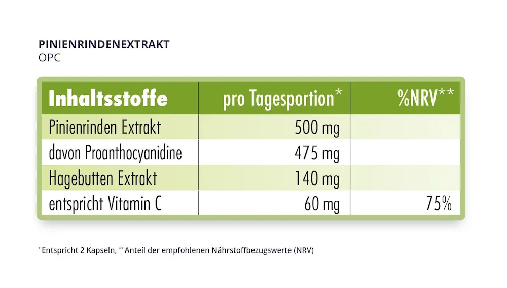 Cada cápsula contiene 250 mg de extracto de corteza de pino con una alta dosis del 95% de proantocianidinas y más de 80 mg de OPC auténtico, así como vitamina C procedente del extracto de escaramujo.