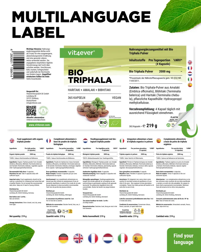 Polvo de triphala ecológico elaborado con amalaki (Emblica officinalis), bibhitaki (Terminalia belerica) y haritaki (Terminalia chebula); agente de recubrimiento: hidroxipropilmetilcelulosa (de origen vegetal).