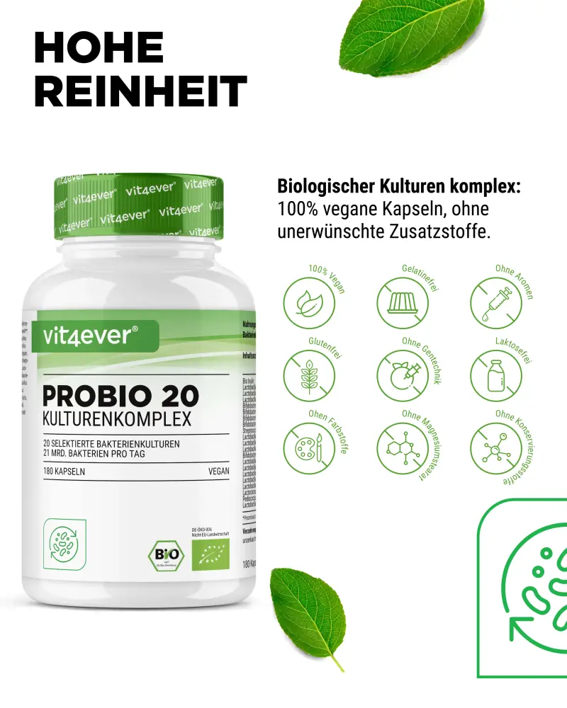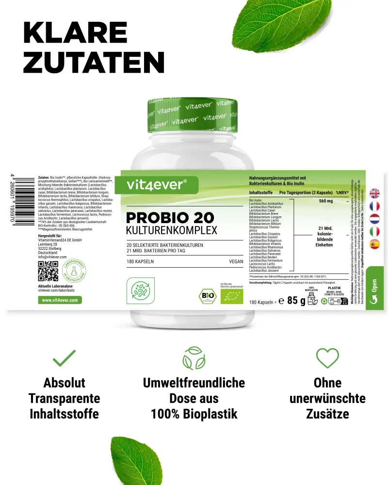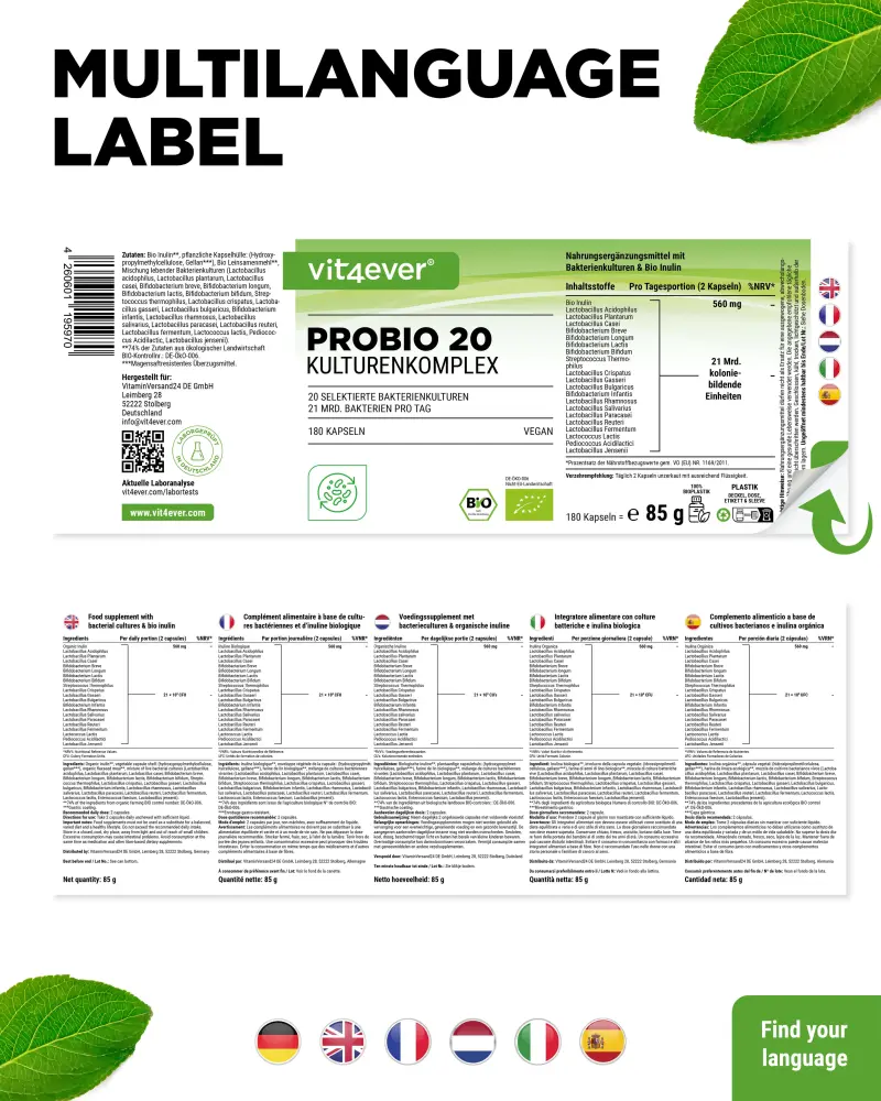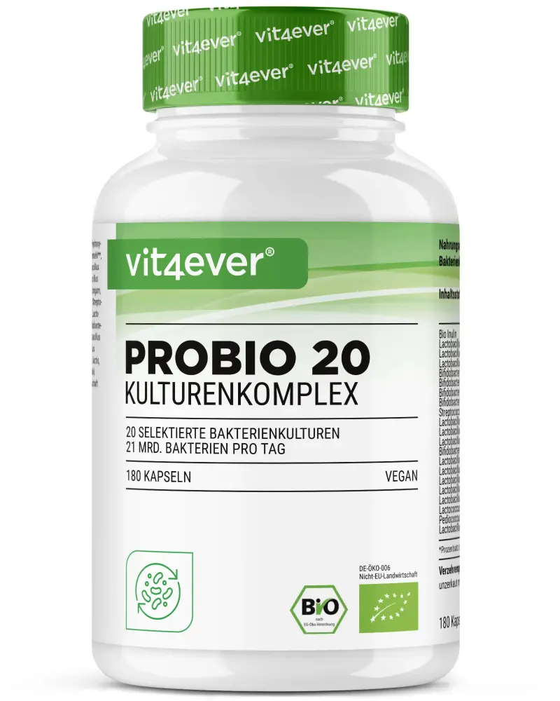 Le complexe Probio 20 contient 20 souches de bactéries avec 21 milliards d’UFC de bonnes bactéries intestinales par portion journalière, ainsi qu’un prébiotique qui sert pratiquement de nourriture aux bactéries intestinales.