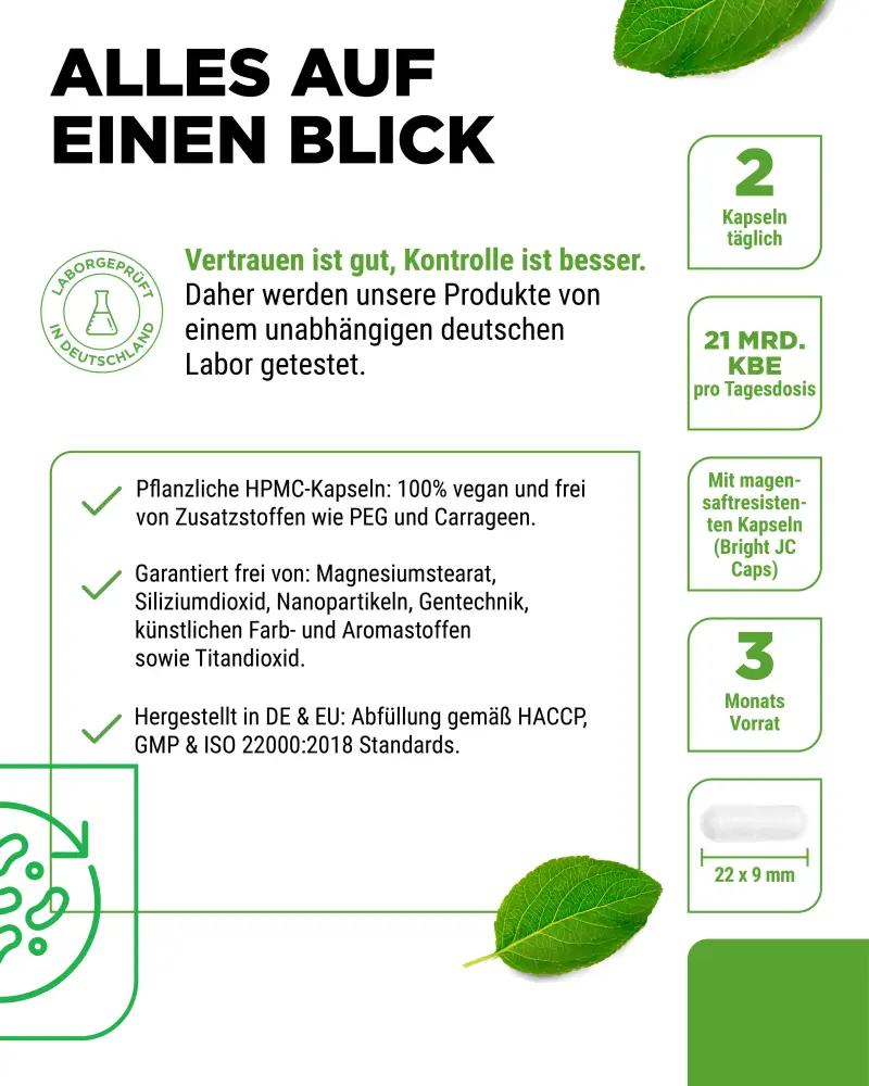 Grâce à l’utilisation de capsules gastro-résistantes (Bright JC Caps), les bactéries arrivent également intactes là où elles sont nécessaires – dans l’intestin.