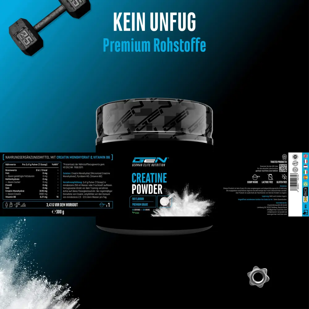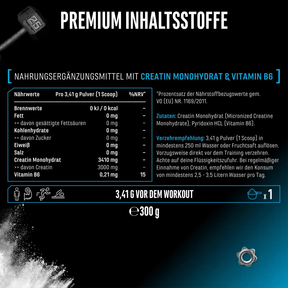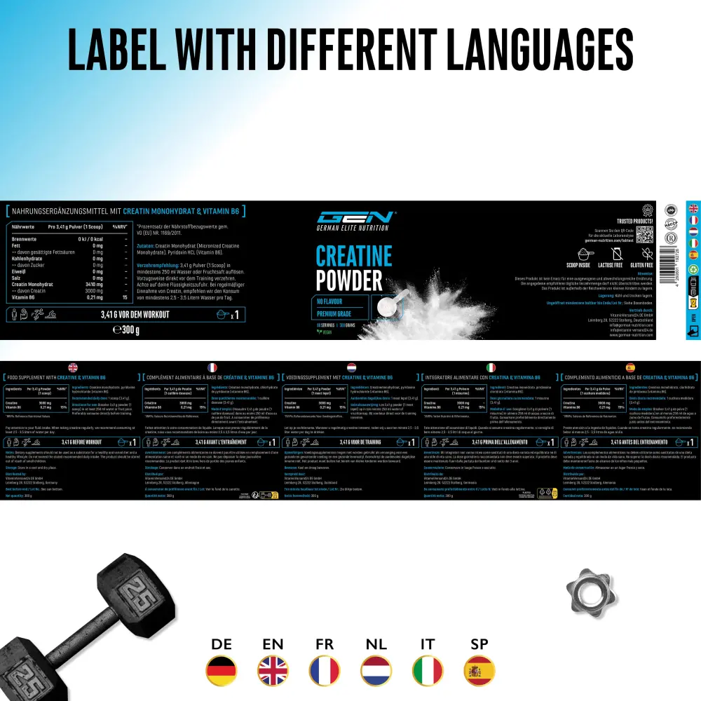 100% Creatina monoidrato (creatina monoidrato micronizzata), piridossina HCL (vitamina B6).