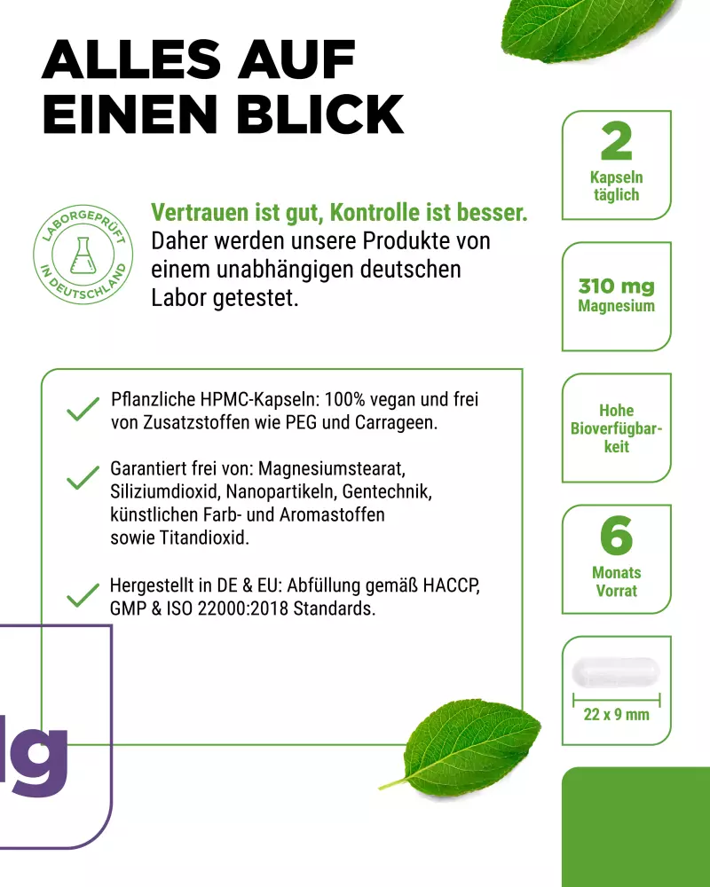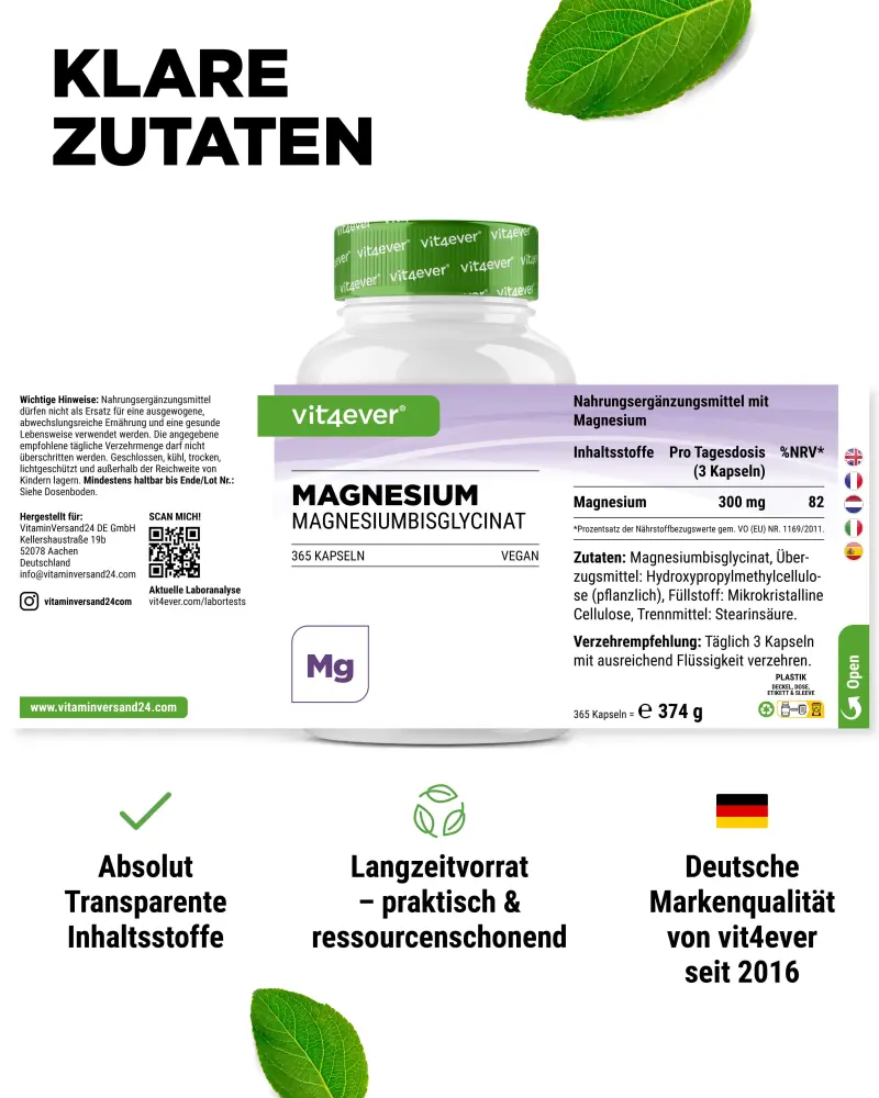 Bisglicinato di magnesio, agente di rivestimento: idrossipropilmetilcellulosa (vegetale), agente di carica: cellulosa microcristallina, antiagglomerante: acido stearico.