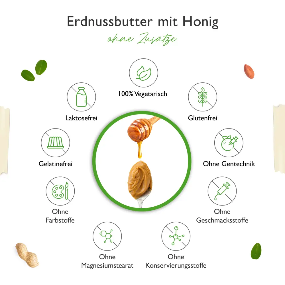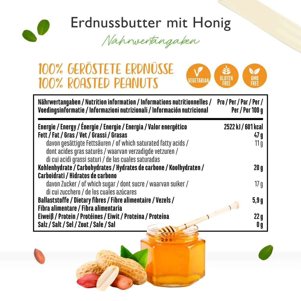 arachidi tostate (80%), miele di fiori (15%), olio di cocco vergine (5%).