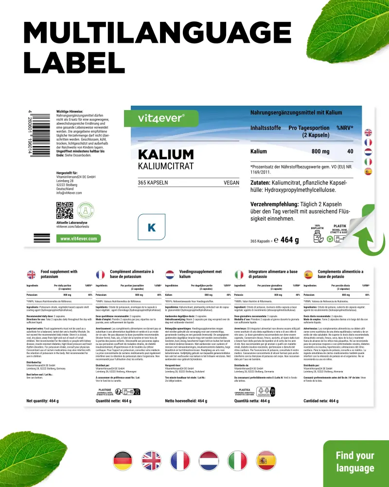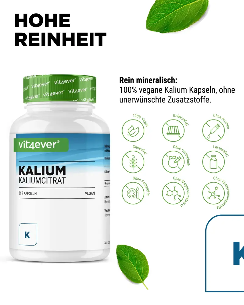 Il potassio (qui sotto forma di citrato di potassio) è un minerale o elettrolita e deve essere ingerito quotidianamente con il cibo.