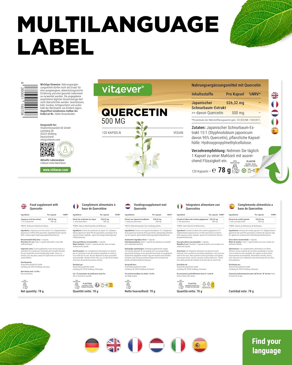 Estratto di albero della corda giapponese 15:1 (Styphnolobium japonicum, di cui il 98% di quercetina), agente di rivestimento: idrossipropilmetilcellulosa (di origine vegetale), agente antiagglomerante: estratto di riso.