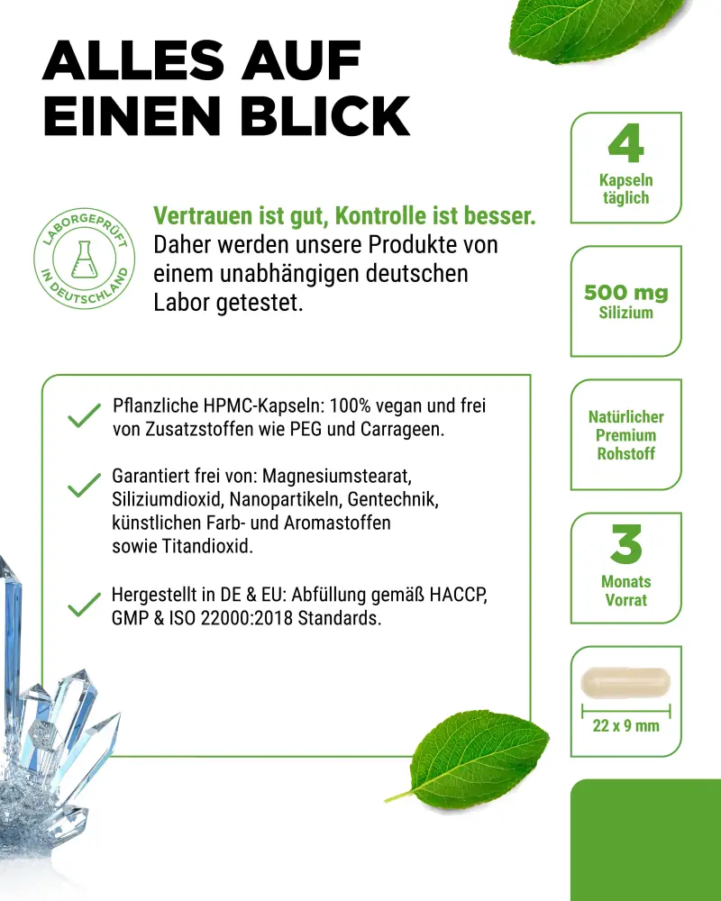 Estratto di germogli di bambù (di cui il 37% di silicio naturale), agente di rivestimento: idrossipropilmetilcellulosa (di origine vegetale).
