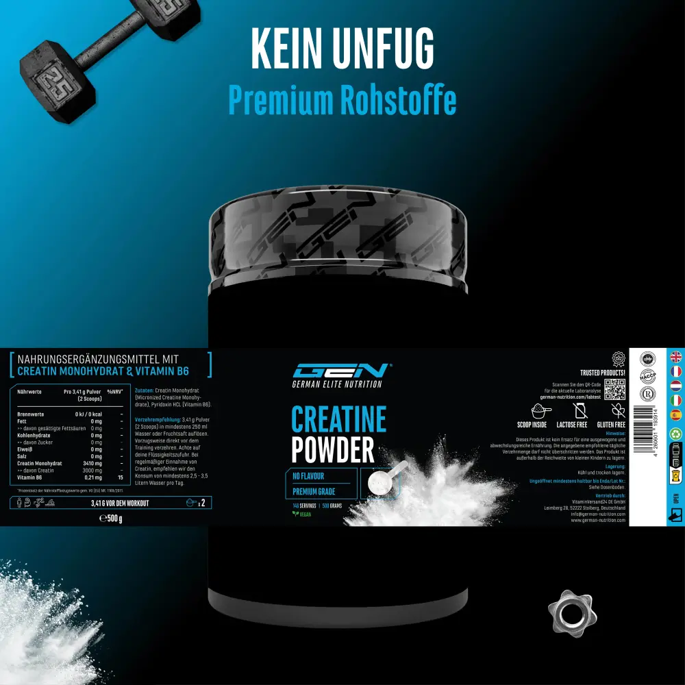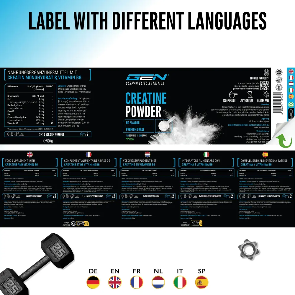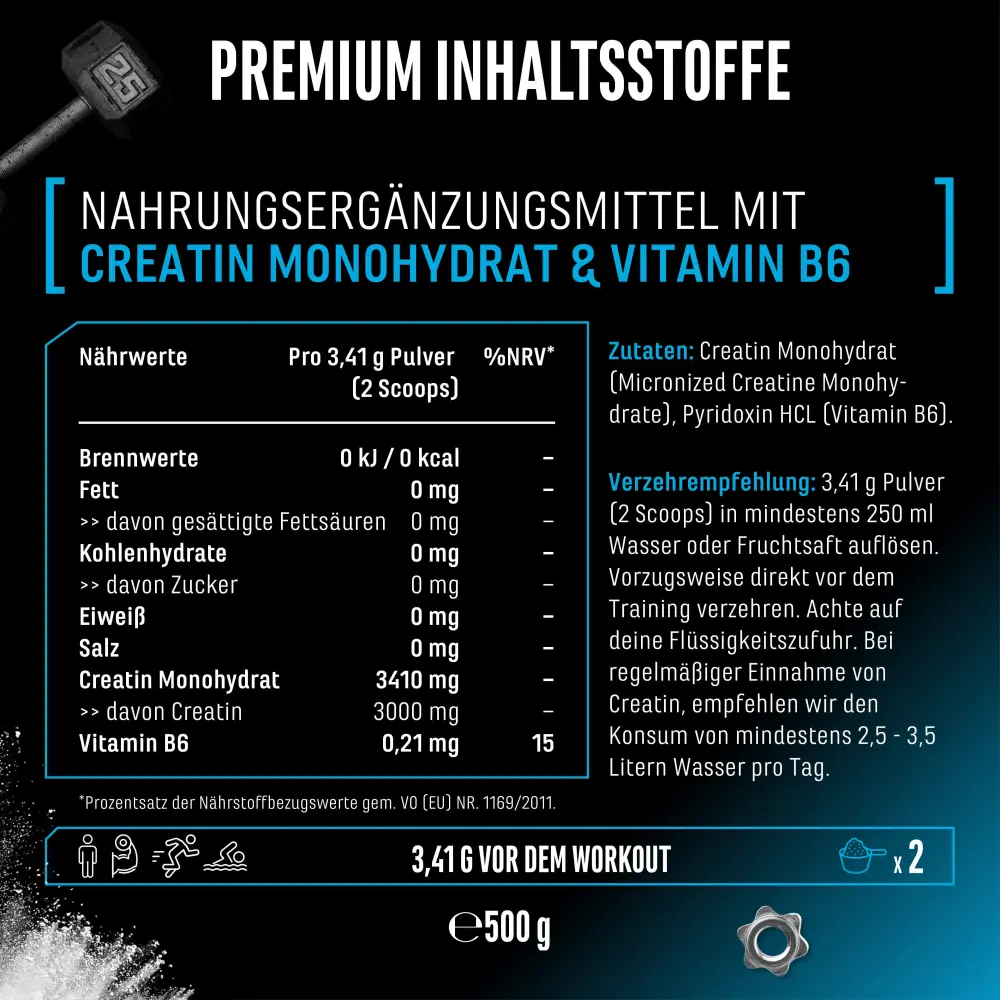 100% Creatine Monohydraat (gemicroniseerd Creatine Monohydraat), Pyridoxine HCL (vitamine B6).