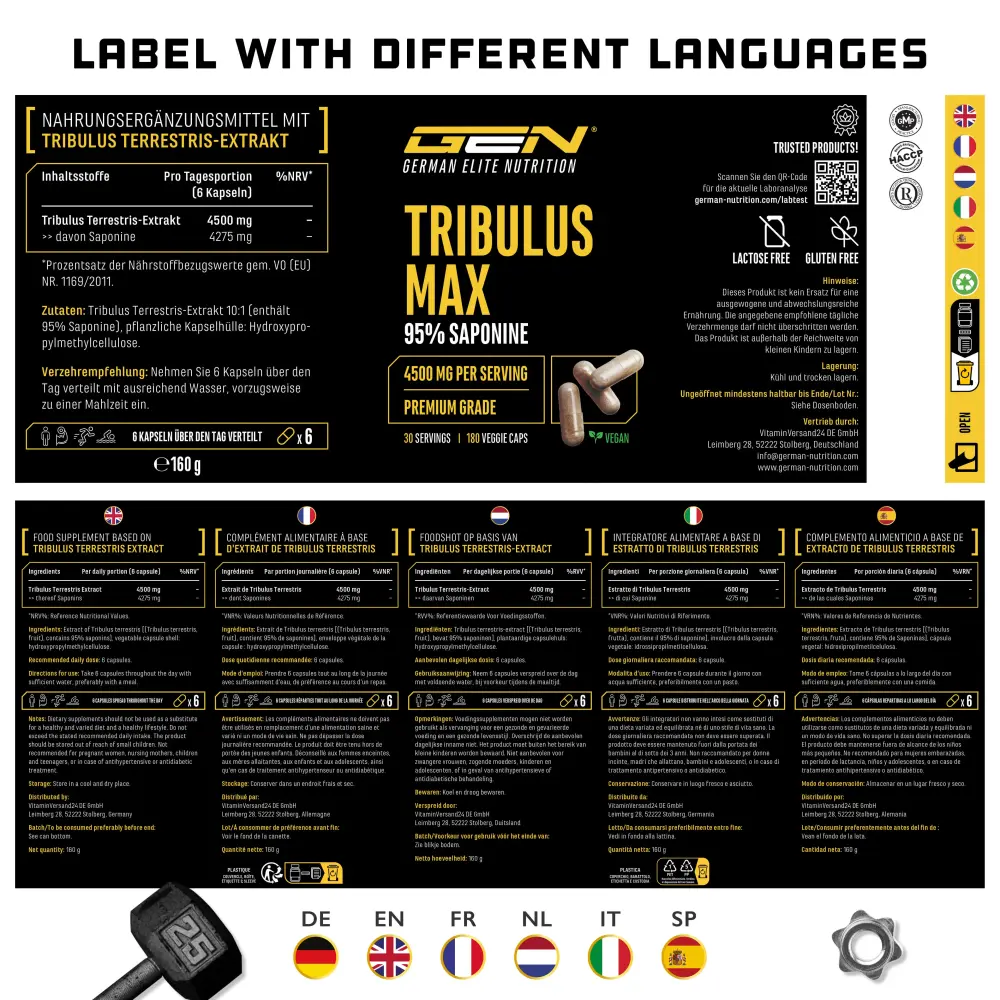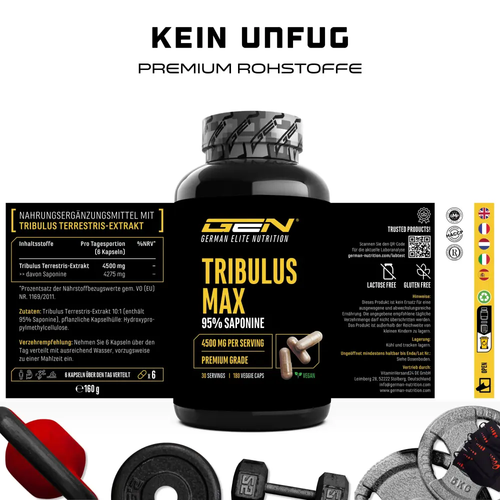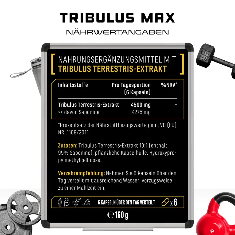 Tribulus Terrestris-extract 10:1 (bevat 95% saponinen), coatingmiddel: hydroxypropylmethylcellulose (plantaardig)