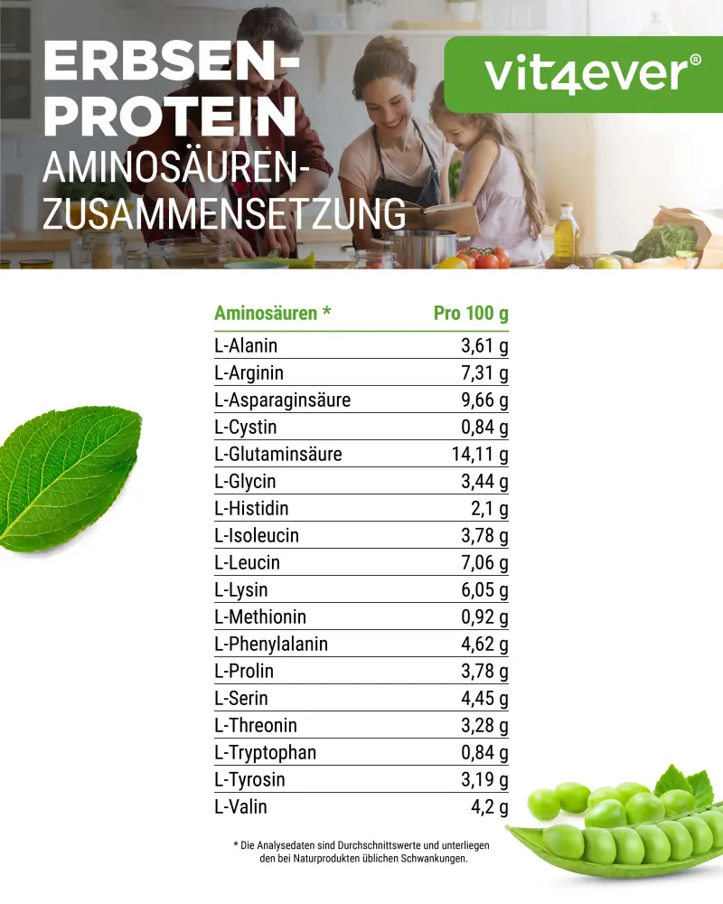 Erwteneiwit biedt een hoog eiwitgehalte van 87% totaal eiwit met een hoog gehalte van meer dan 7% arginine en 6% lysine en bevat ook veel natuurlijk ijzer, fosfor en calcium.