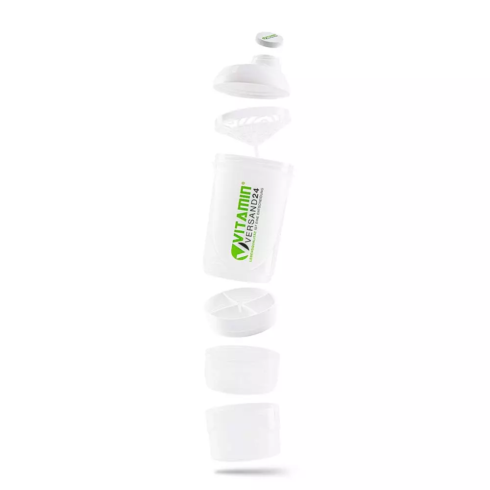 Praktische shaker met extra opbergvakken voor poeder, tabletten, pillen enz. en opdruk.