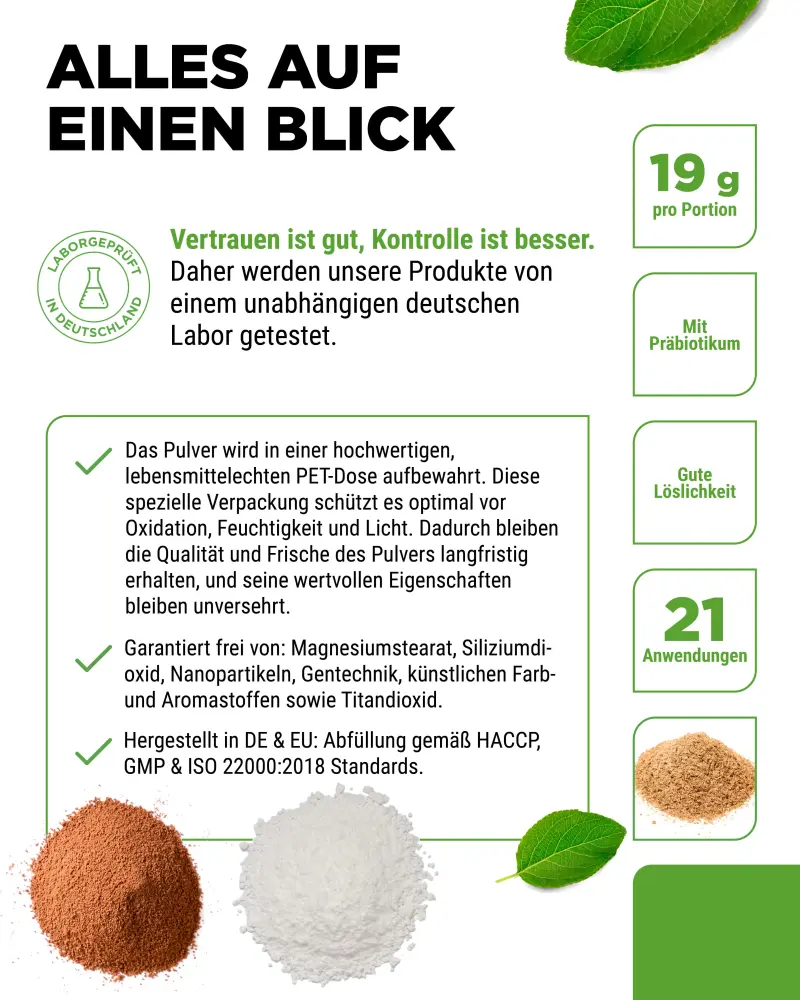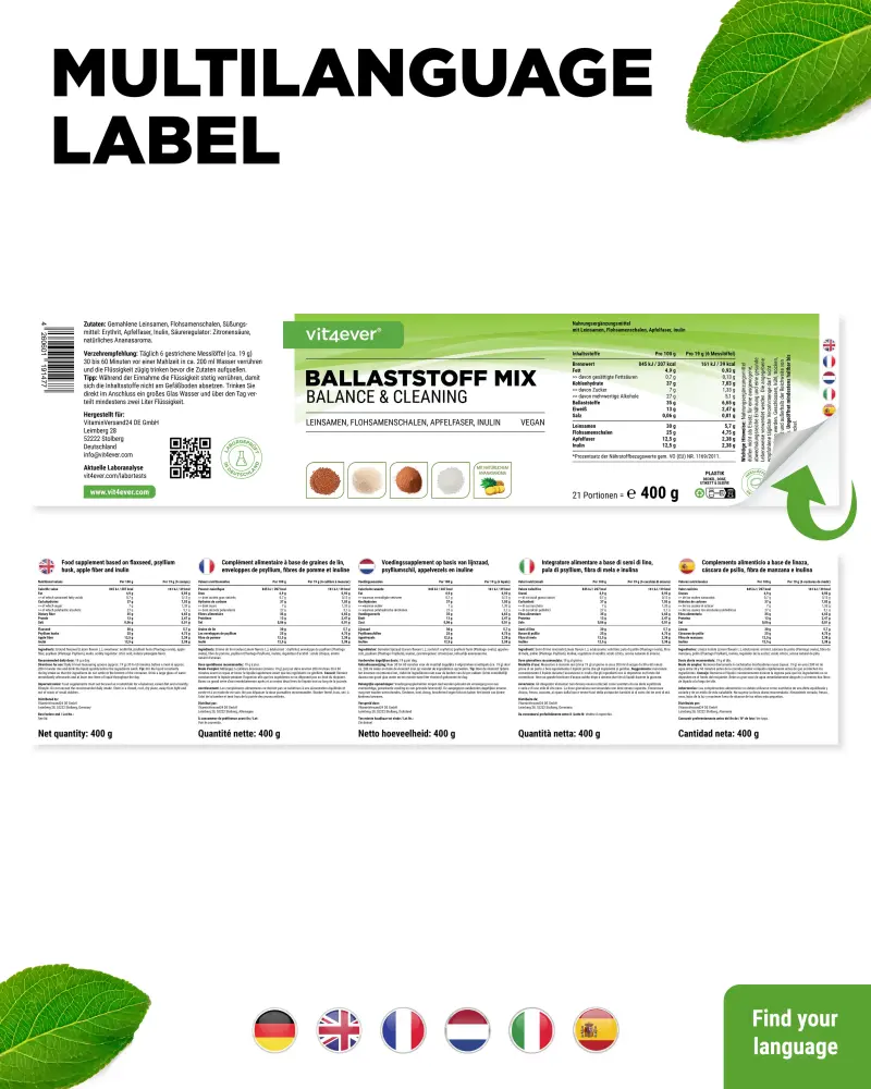 Gemahlene Leinsamen (Linum flavum L.), Süßungsmittel: Erythrit, Flohsamenschalen (Plantago ovata), Apfelfasern, Flohsamen (Plantago Psylium), Inulin, Säureregulator: Zitronensäure, natürliches Ananasaroma