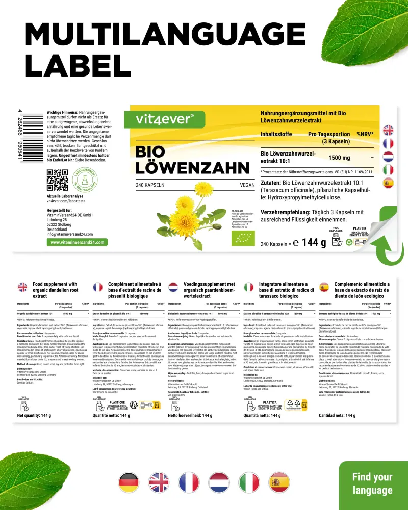 Bio Löwenzahnwurzelextrakt 10:1 (Taraxacum officinale), Überzugsmittel: Hydroxypropylmethylcellulose (pflanzlich).