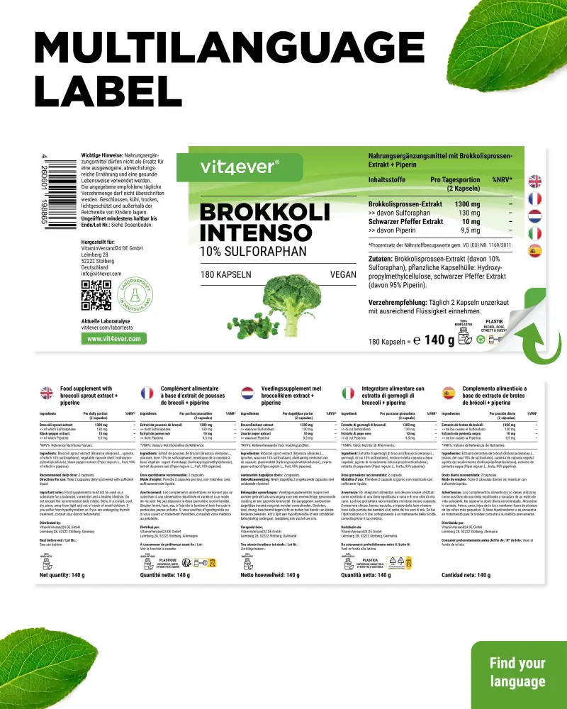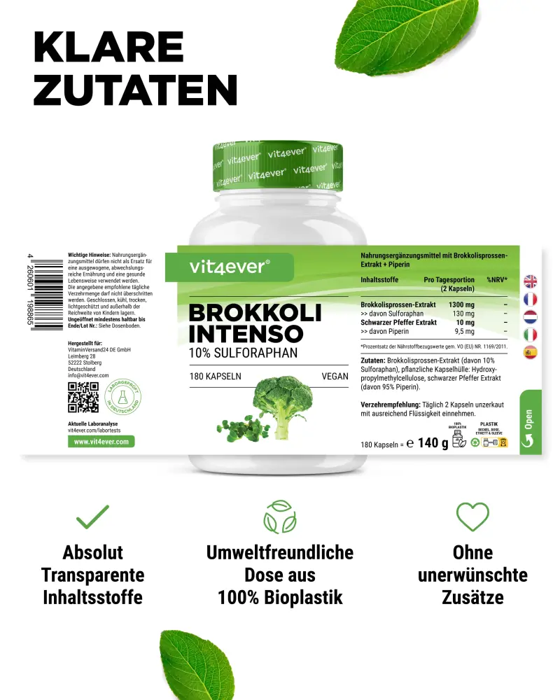 Brokkolisprossen-Extrakt (davon 10% Sulforaphan), Überzugsmittel: Hydroxypropylmethylcellulose (pflanzlich), Trennmittel: Stearinsäure