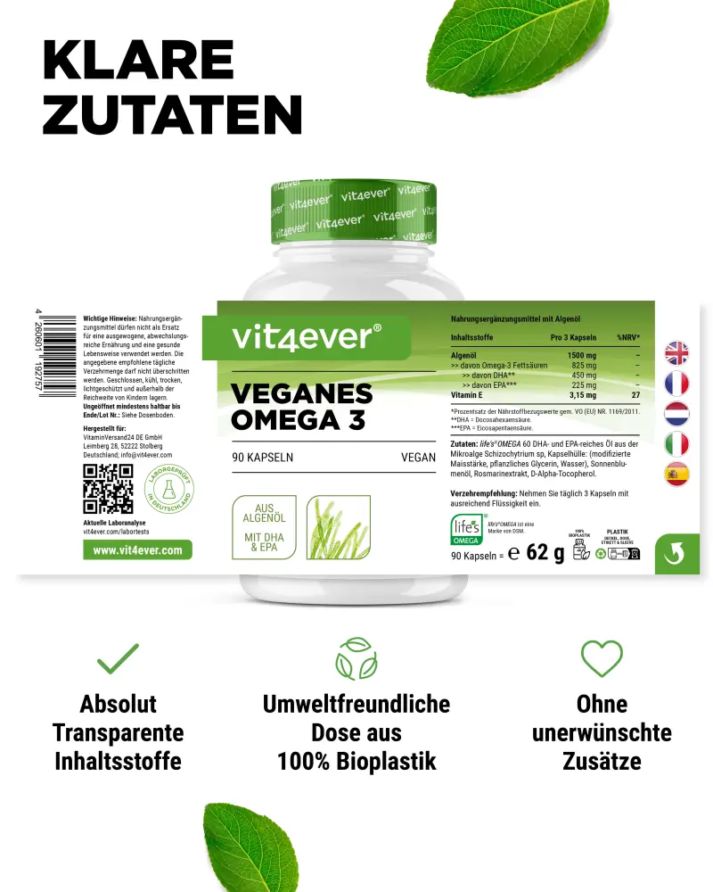 Algenöl Omega 3 Kapseln aus der Schizochytrium sp. mit 30% → DHA (Docosahexaensäure) und 15% → EPA (Eicosapentaensäure).