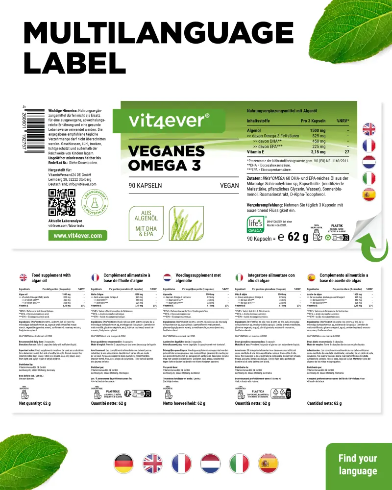 life´s Omega™ 60 Algenöl (Schizochytrium sp.), Sonnenblumenöl mit hohem Fettgehalt, Rosmarin Extrakt, Tocopherolen, Ascorbylpalmitat, Überzugsmittel: Softgel-Kapsel (modifizierte Maisstärke), Verdickungsmittel: Carrageenan, Säureemulgator: Natriumcarbonat.