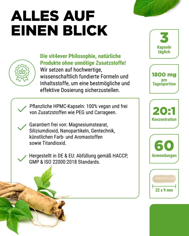 Der 20:1 Extrakt liefert Dir mit jeder Kapsel 120 mg Gensenosiden.