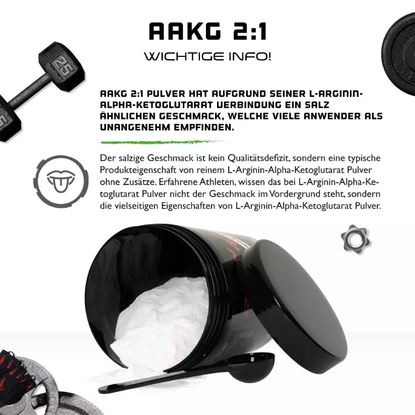Nota: O pó de alfa-cetoglutarato de L-arginina tem normalmente um sabor salgado, o que deve ser considerado como um sinal da pureza do produto.