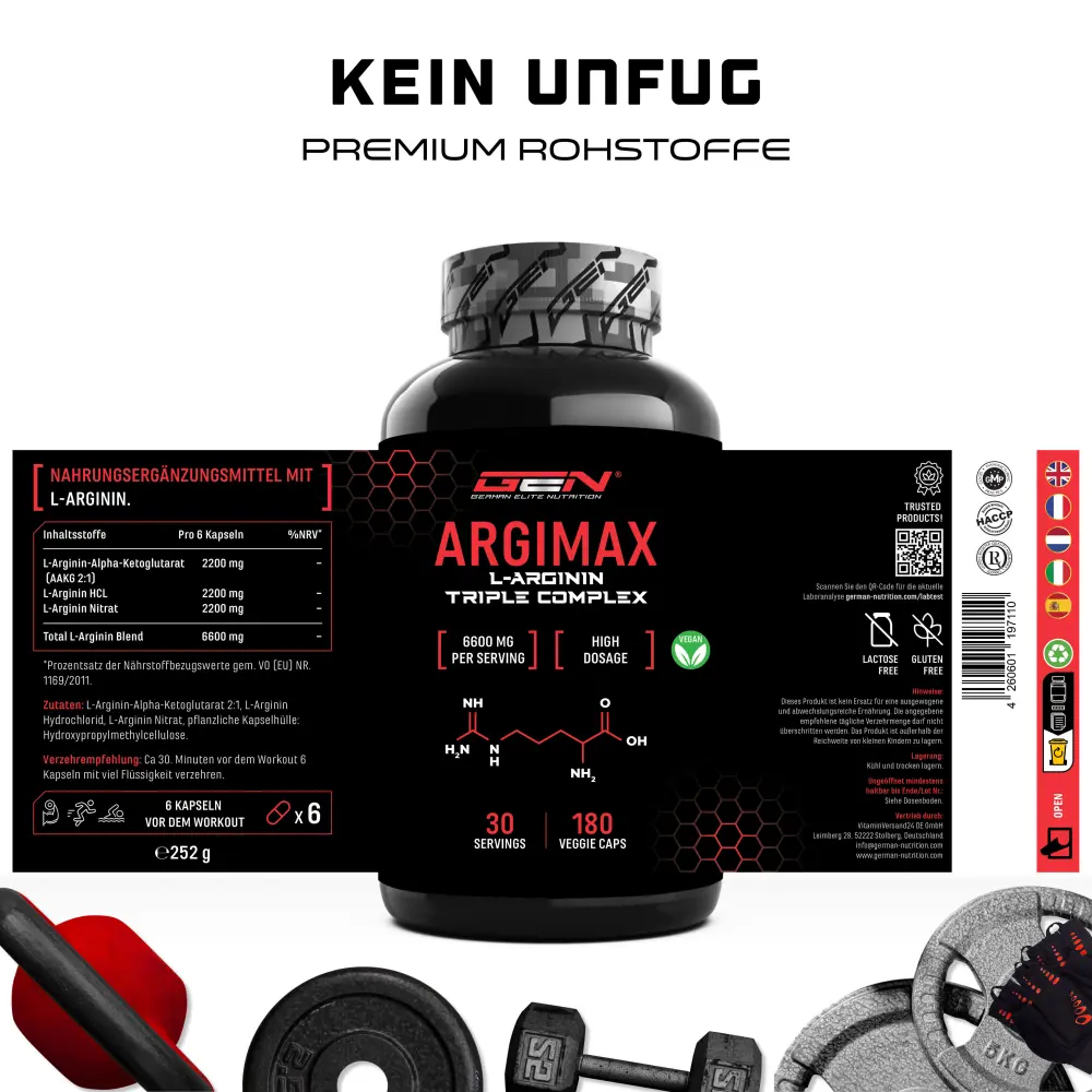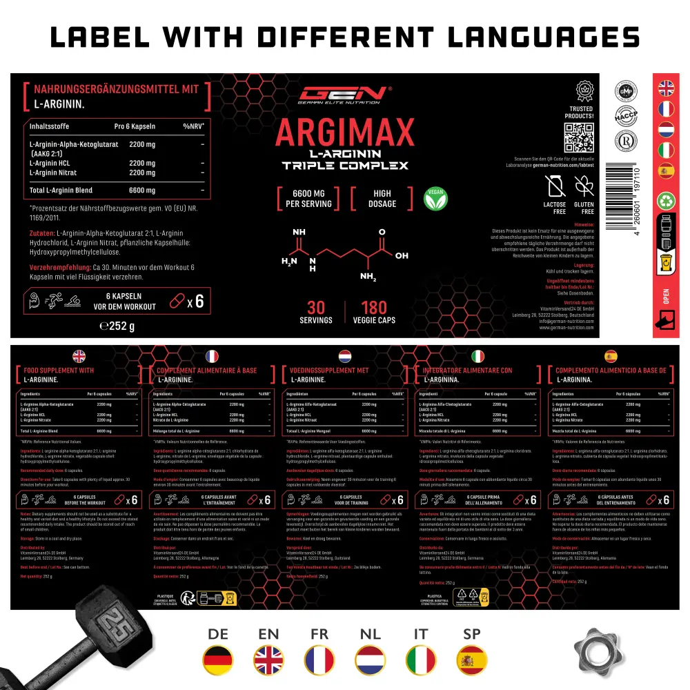 O Argimax L-Arginine Triple Complex contém três formas diferentes de arginina (AAKG (2:1), L-Arginina HCL e Nitrato de L-Arginina) para suportar um fornecimento uniforme do ingrediente ativo.