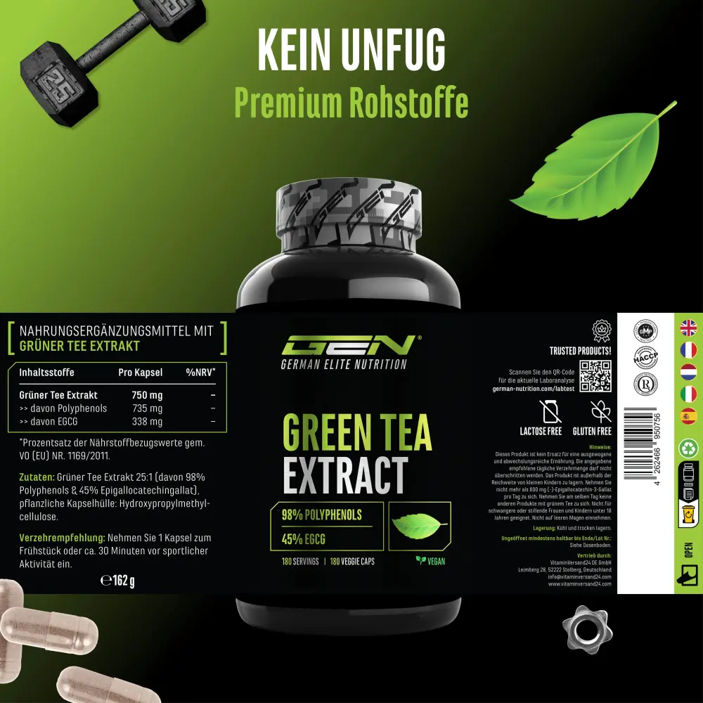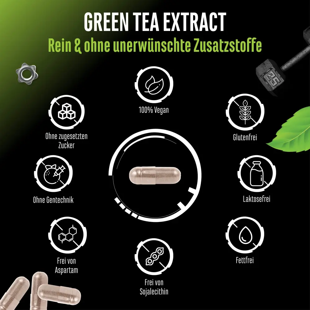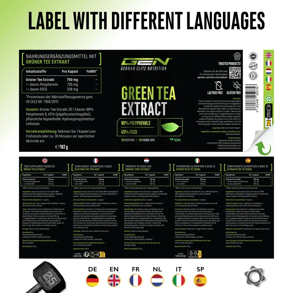 Extrato de chá verde (98% de polifenóis e 45% de epigalocatequina galato), agente de revestimento: hidroxipropilmetilcelulose (vegetal)