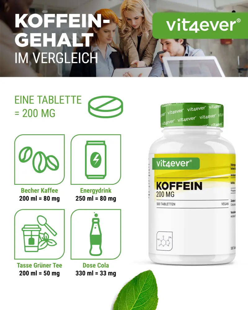 A dosagem de um comprimido corresponde a cerca de meio litro de café/bebida energética ou 0,8 litros de chá verde ou dois litros de cola.