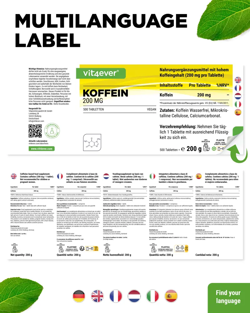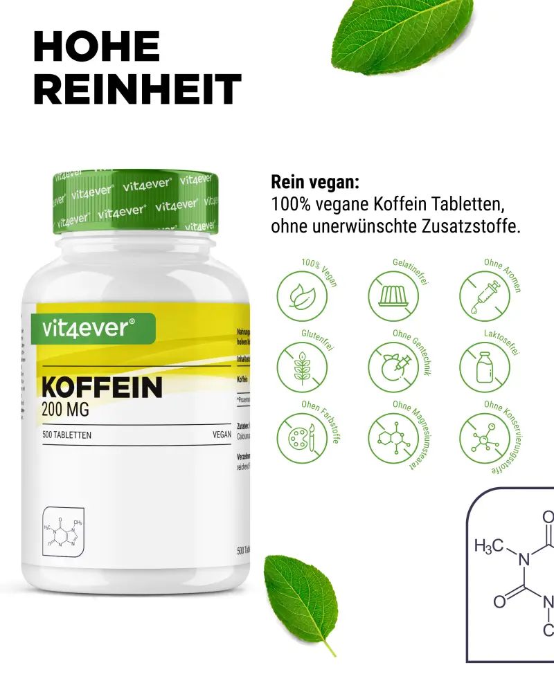 Comprimidos de cafeína em dose elevada com 200 mg de cafeína por comprimido.