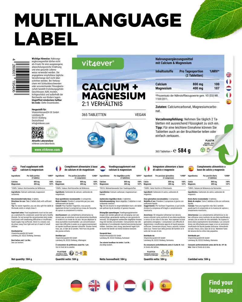 Os comprimidos de Cálcio + Magnésio da vit4ever contêm uma proporção ideal de 2:1 de cálcio para magnésio.