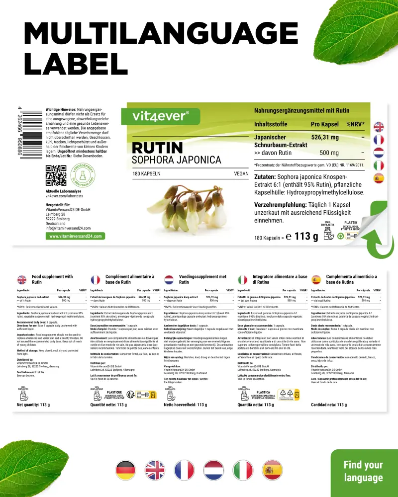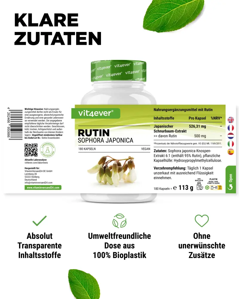 Extrato de botões de Sophora japonica (contém 95% de rutina), agente de revestimento: hidroxipropilmetilcelulose (vegetal).