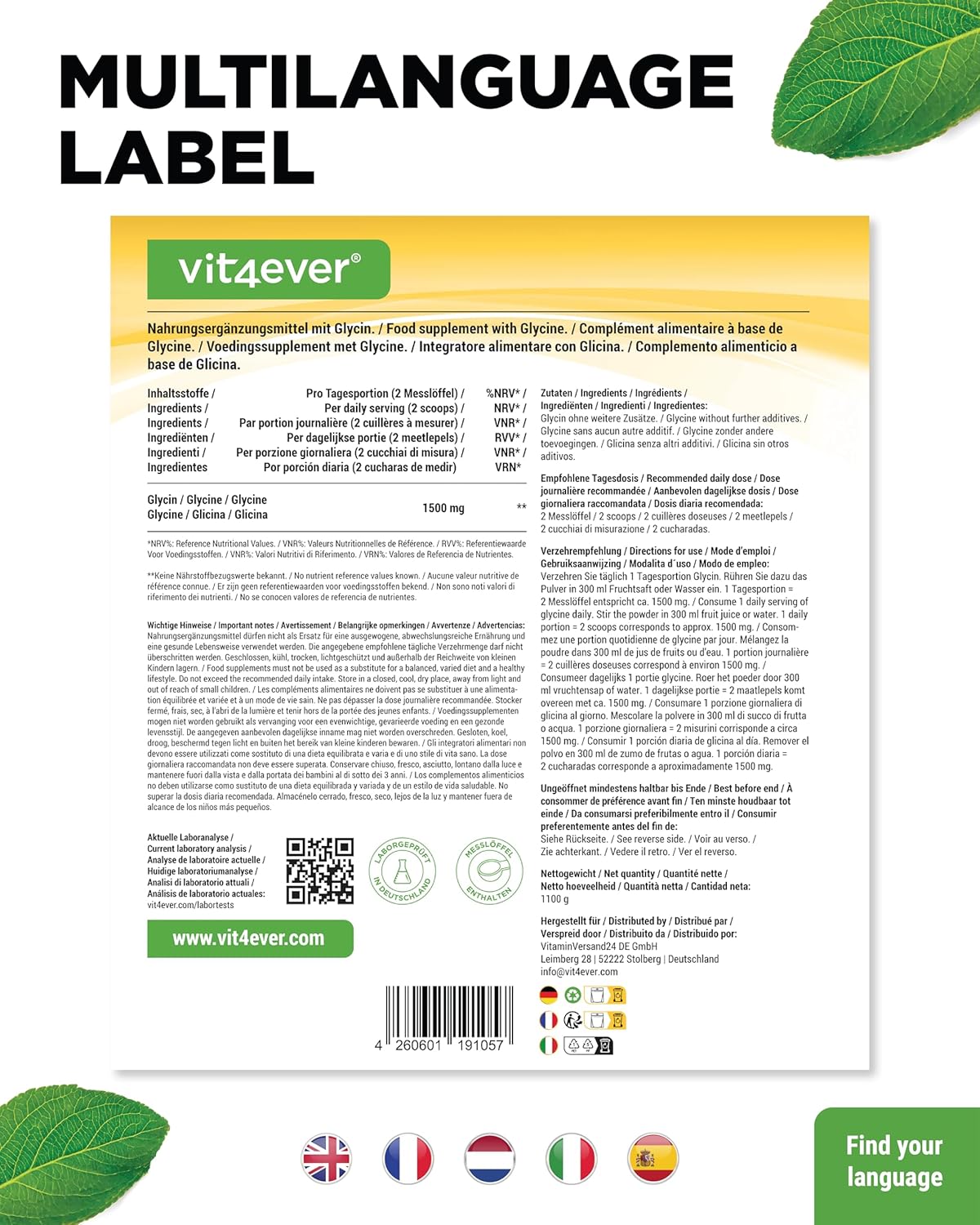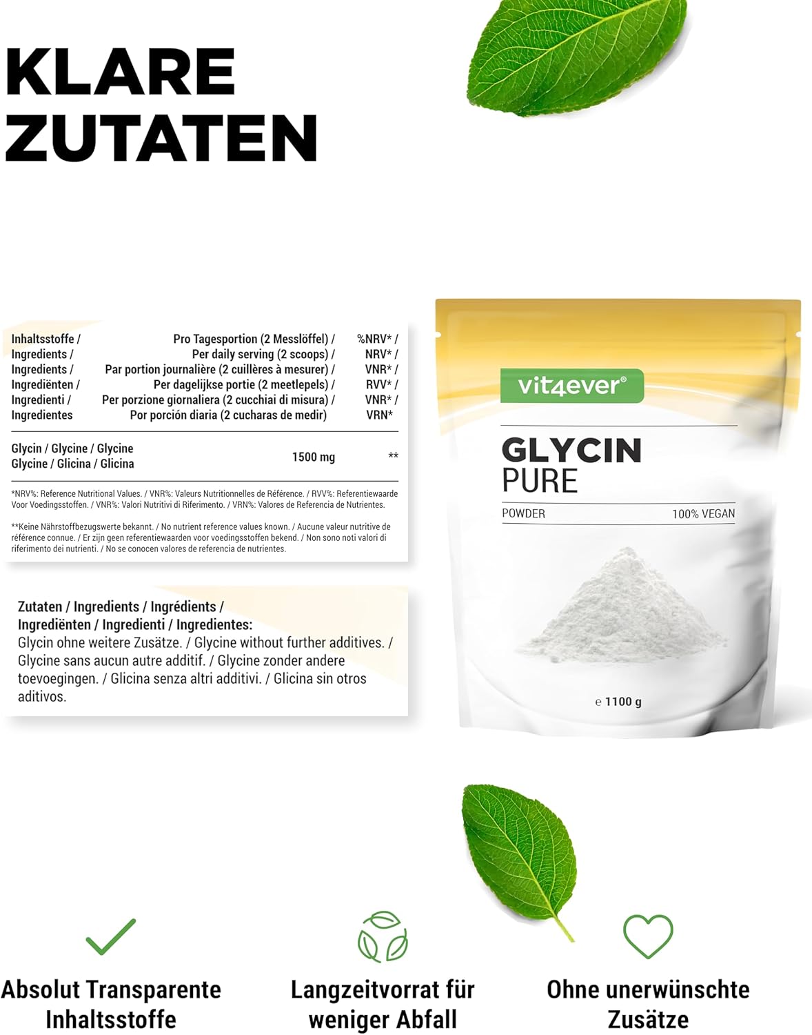 A glicina é um aminoácido proteinogénico não essencial e é necessária ao organismo para a formação de glutatião, colina, porfirinas, purinas, creatina, colagénio e hemoglobina, entre outros.