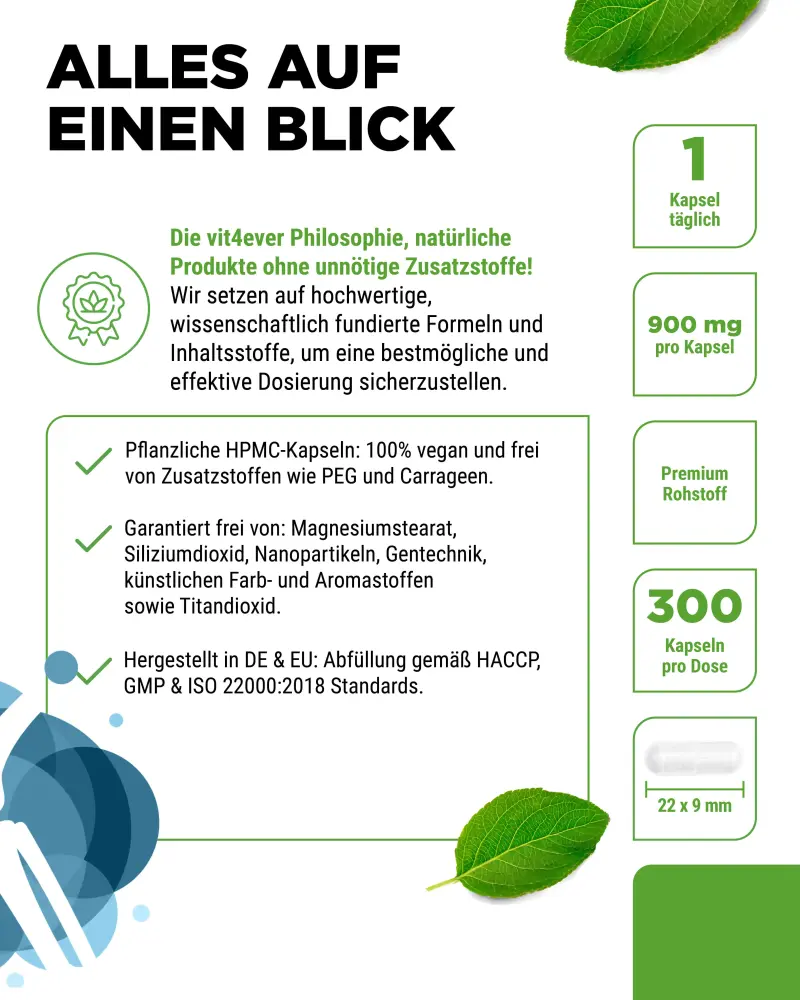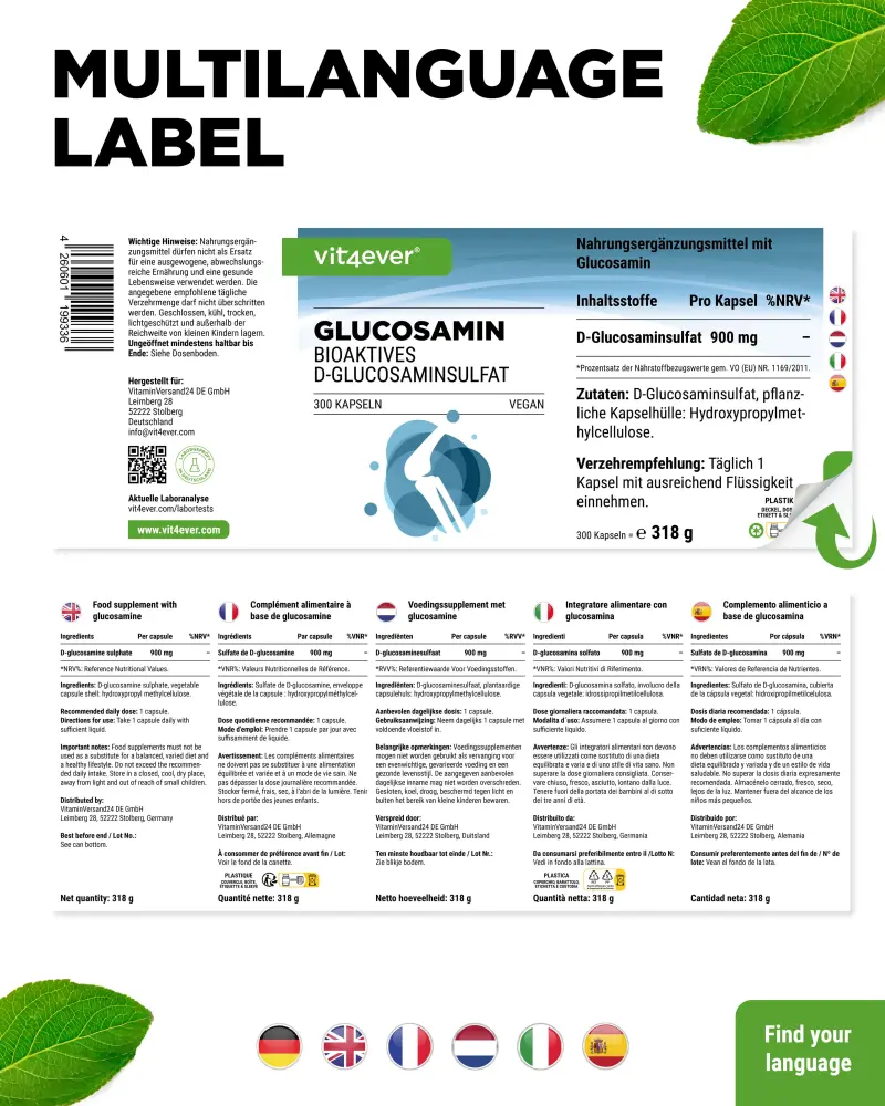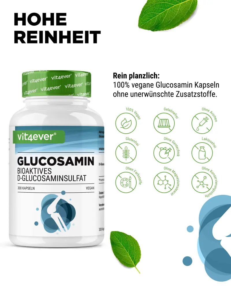 As cápsulas contêm sulfato de D-glucosamina bioativo de pureza elevada e, por isso, são adequadas também para veganos.
