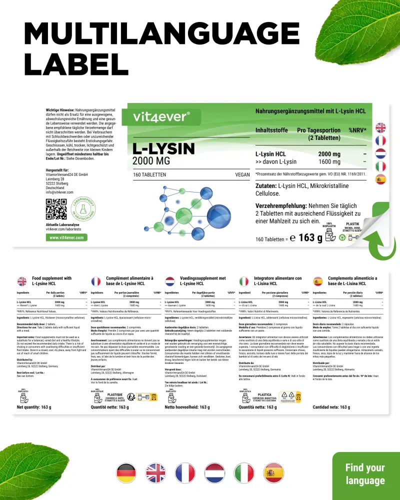 L-lisina HCL, celulose microcristalina (agente de volume).
