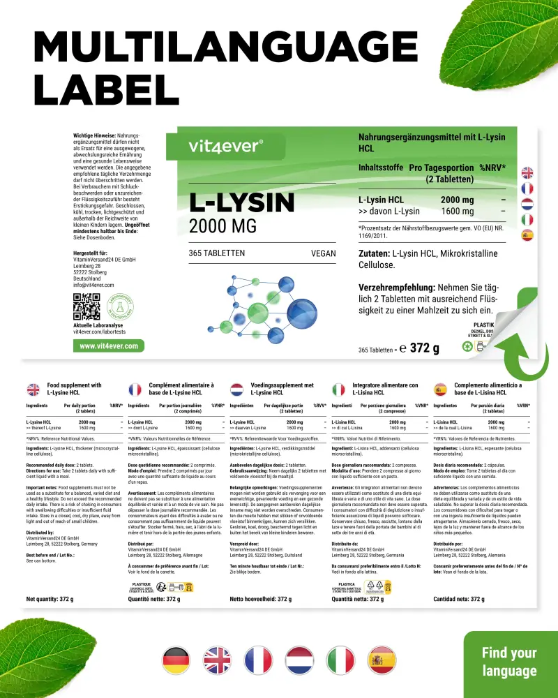 L-lisina HCL, celulose microcristalina (agente de volume).