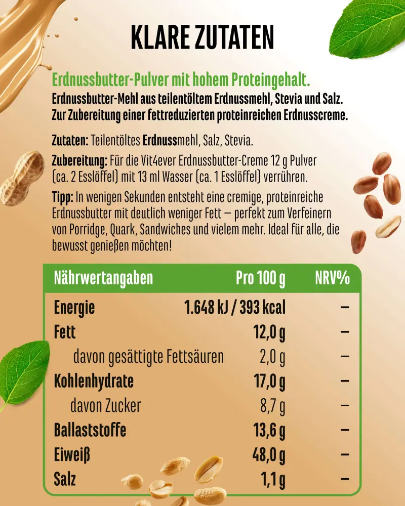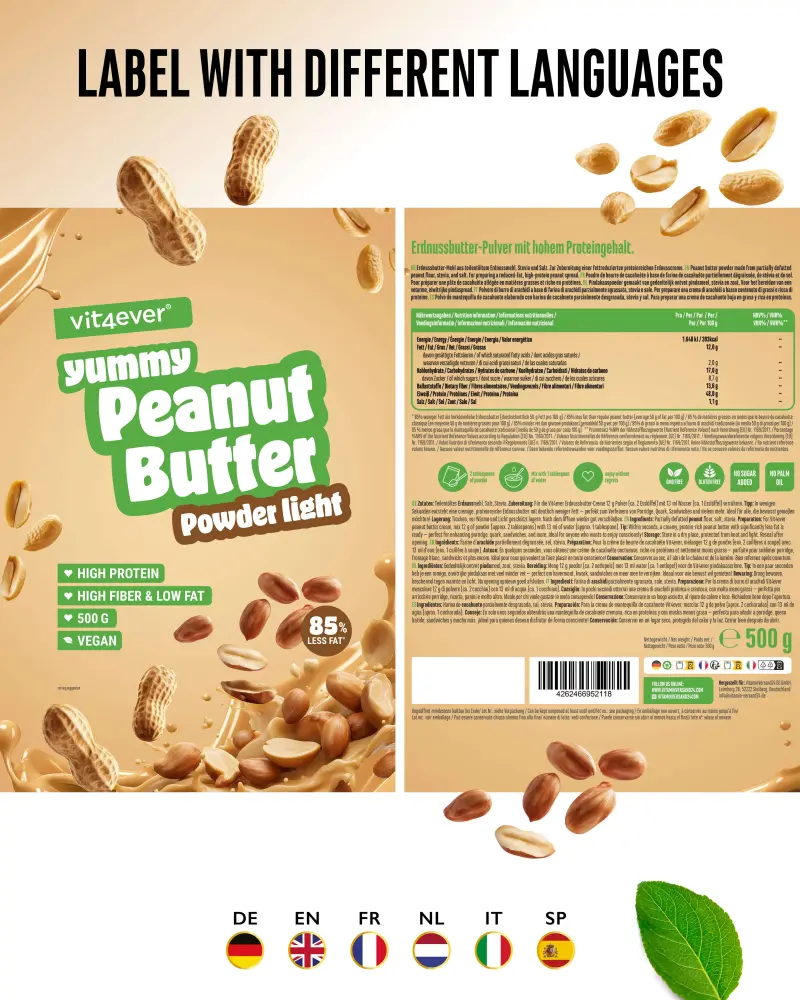 Este pó contém 85 % menos gordura do que a manteiga de amendoim normal, mas mantém todo o aroma e sabor.