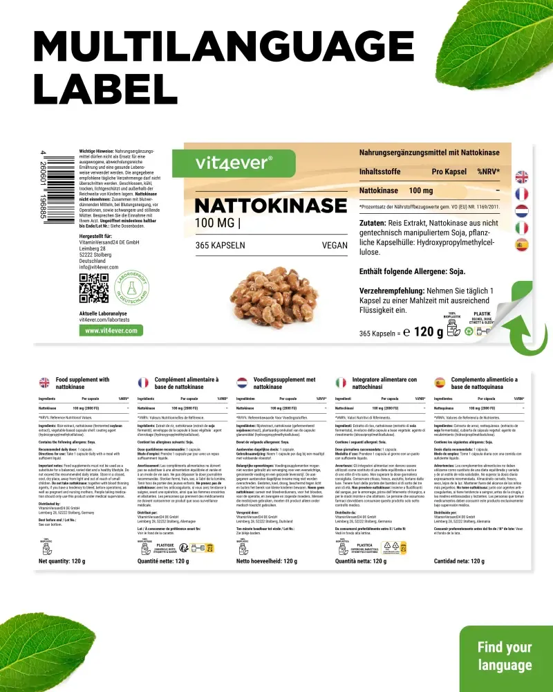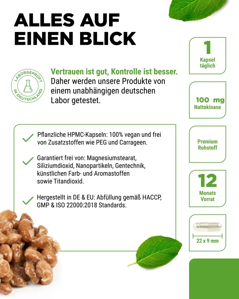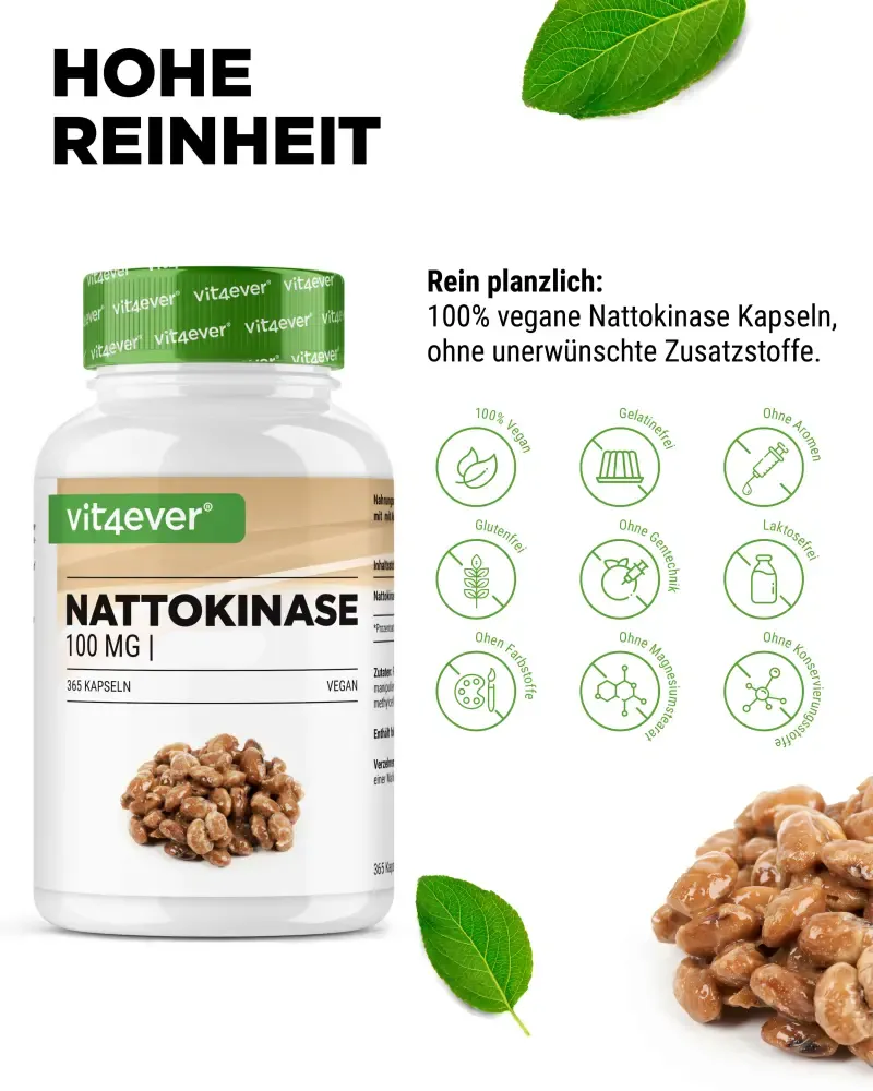 Cápsulas de Nattokinase contendo 100 mg de nattokinase pura por cápsula.