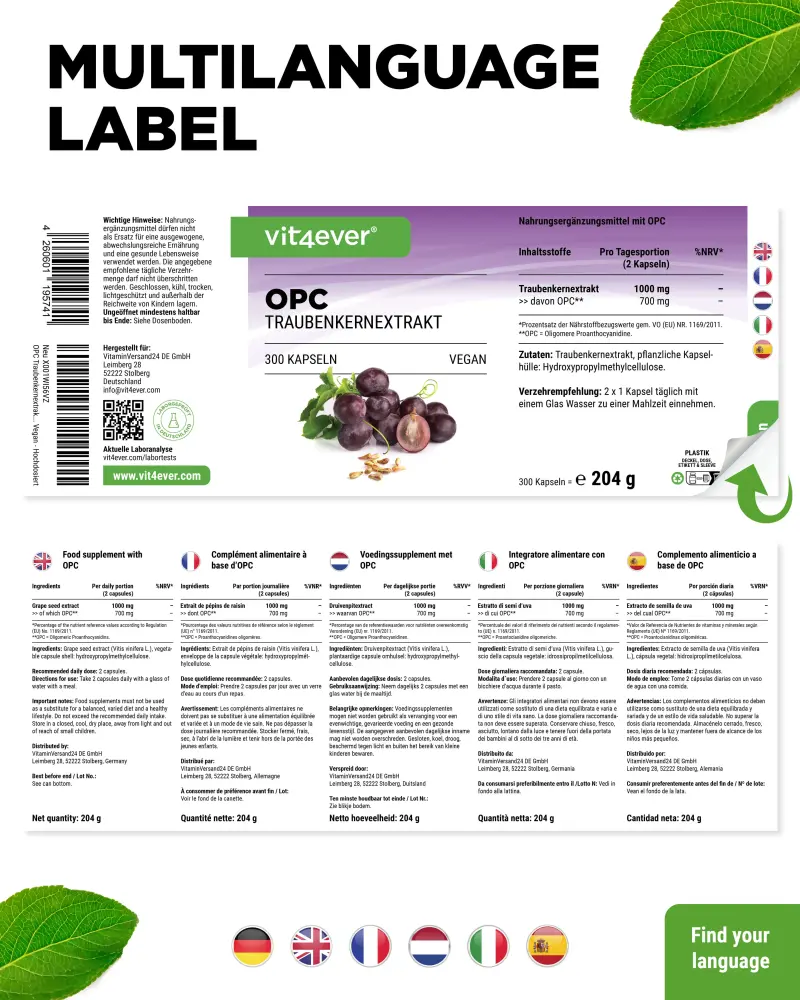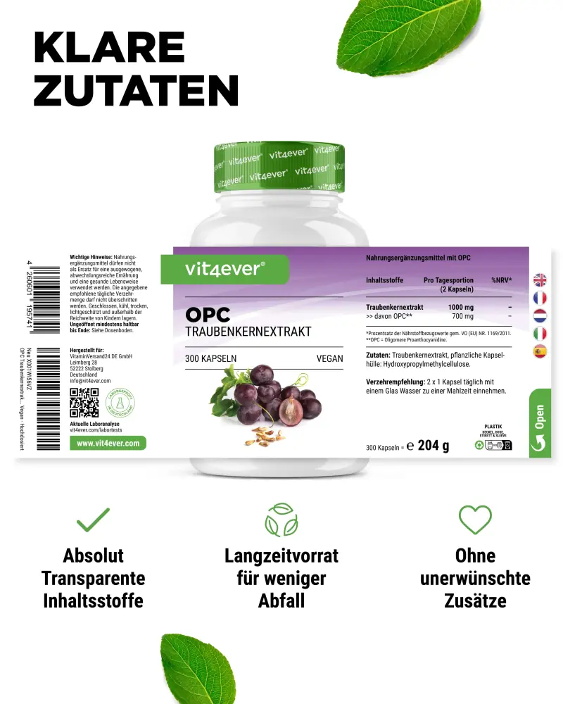 → Segundo o método HPLC: 350 mg de OPC (70% de proantocianidina oligomérica)