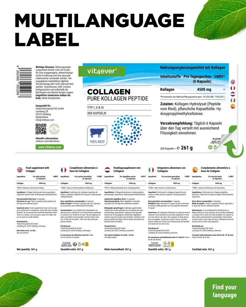 Peptídeos de hidrolisado de colagénio (bovino), agente de revestimento: hidroxipropilmetilcelulose (de origem vegetal).