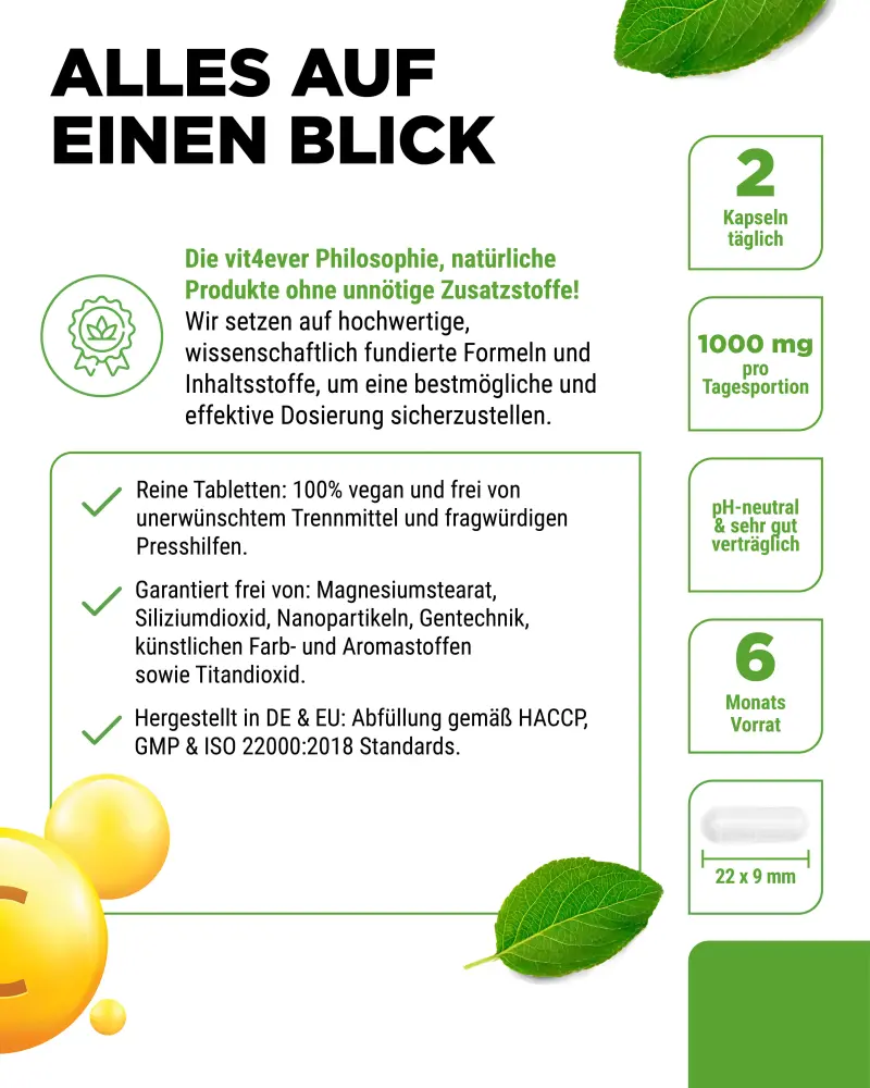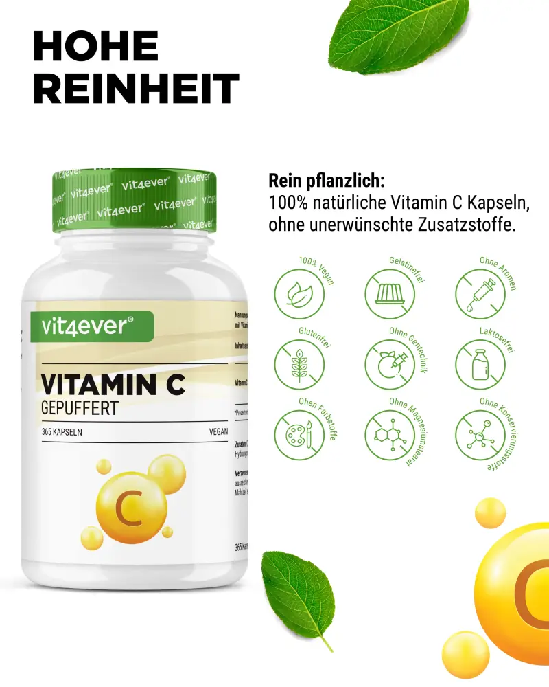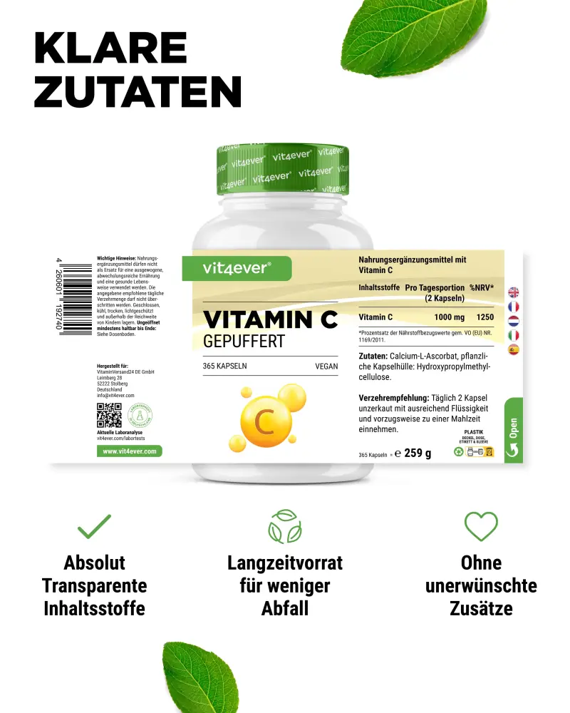 “Tamponada” → a vitamina C, neste caso sob a forma de ascorbato de cálcio (L-ascorbato de cálcio), é libertada uniformemente no organismo em pequenas quantidades ao longo de várias horas (efeito de libertação no tempo) e tem simultaneamente uma biodisponibilidade muito elevada.