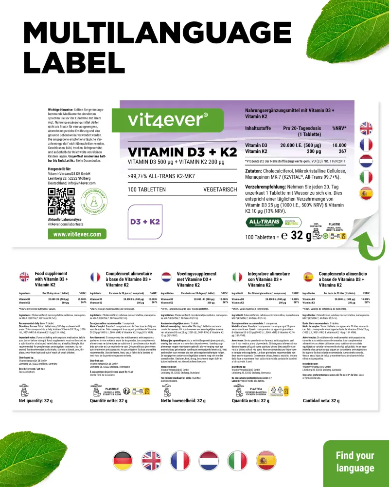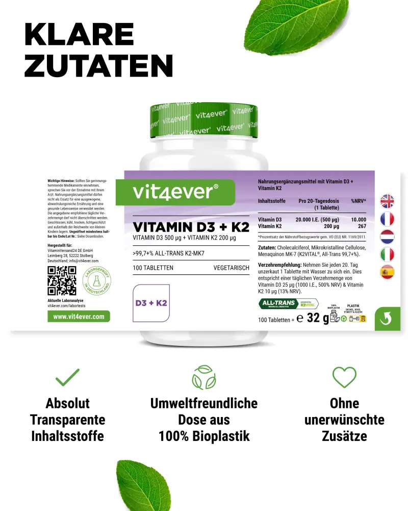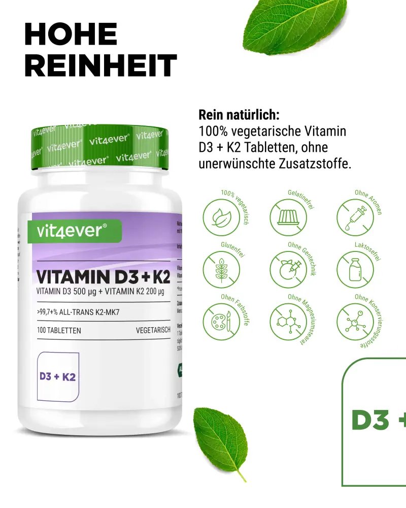 Colecalciferol (vitamina D3), celulose microcristalina (agente de volume), menaquinona MK-7 (K2VITAL, All-trans 99+%).