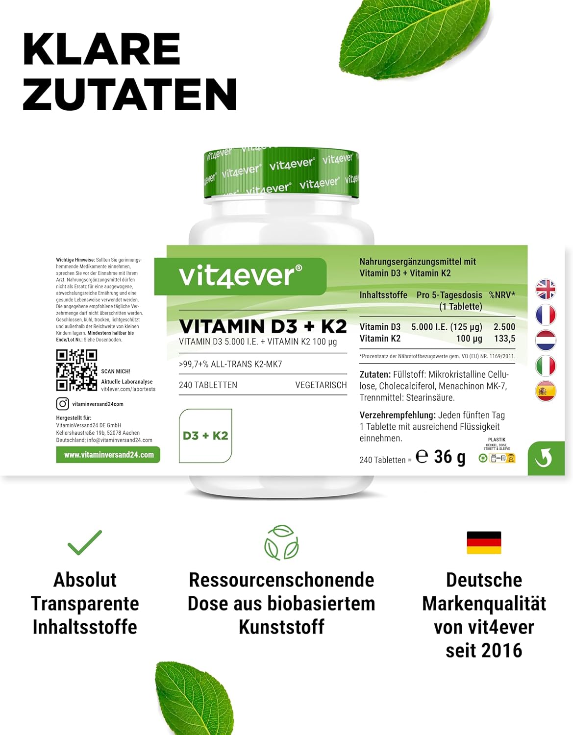 Colecalciferol (vitamina D3), celulose microcristalina (agente de enchimento), menaquinona MK-7 (99+% all-trans).